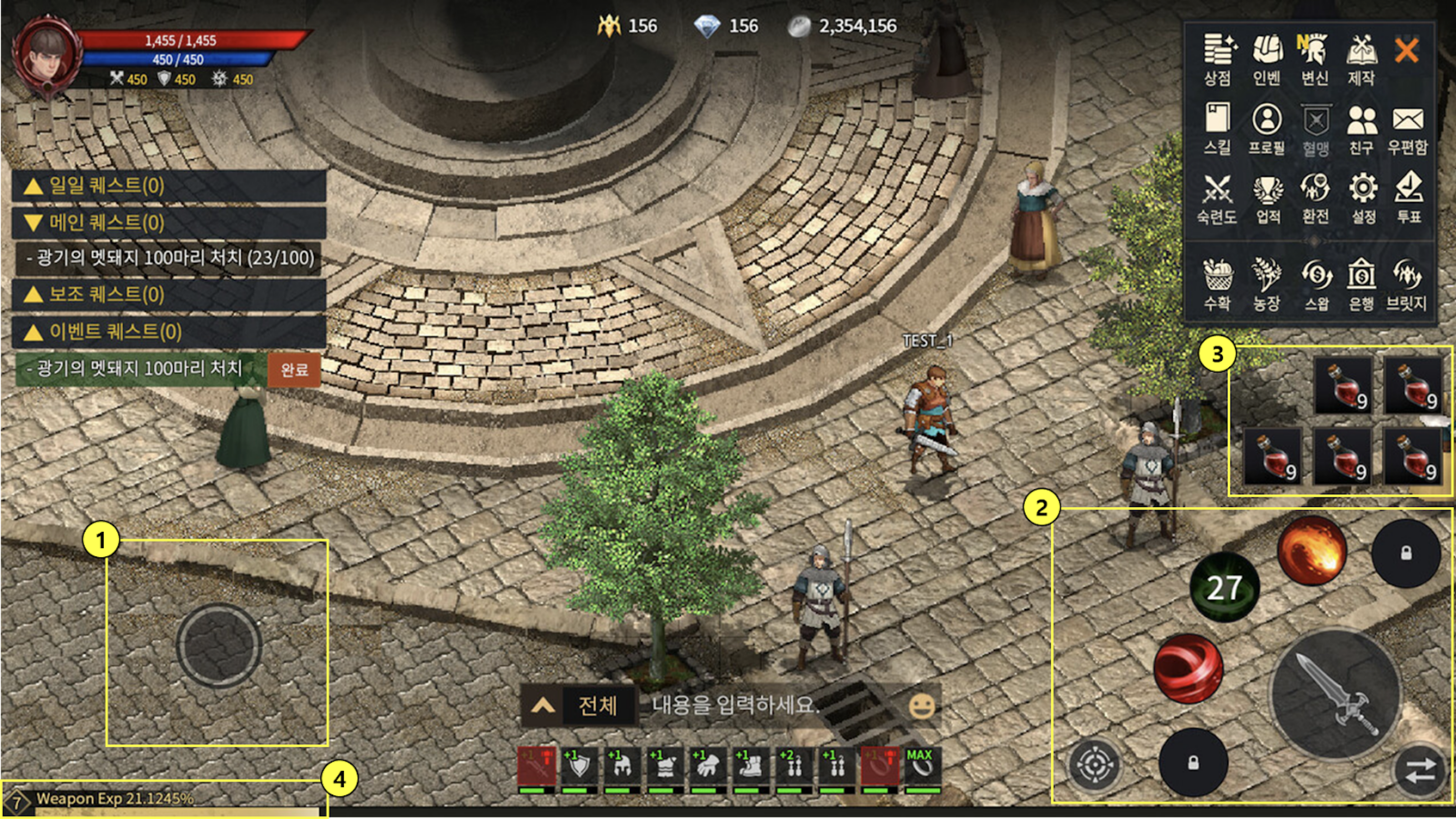 <table><thead><tr><th width="84.33333333333331">No.</th><th width="174">Feature</th><th>Description</th></tr></thead><tbody><tr><td>1</td><td>Joystick</td><td>The joystick allows you to move your character.</td></tr><tr><td>2</td><td>Combat Features</td><td><p>Attack Button: This enables you to perform the basic attacks of your character.</p><p>Skill Buttons: These enable you to utilize the skills assigned to the quick slots.</p><p>Switch Button: Clicking this button will switch to the next tab of quick slots.</p><p>Target Button: This allows you to select the nearest enemy as your target.</p></td></tr><tr><td>3</td><td>Consumable Items</td><td>You can use consumable items assigned to quick slots.</td></tr><tr><td>4</td><td>Weapon Mastery</td><td><p>The mastery level and experience points for the currently equipped weapon are visible here.</p><p>By clicking the Proficiency button in the menu, you can access more detailed information.</p></td></tr></tbody></table>