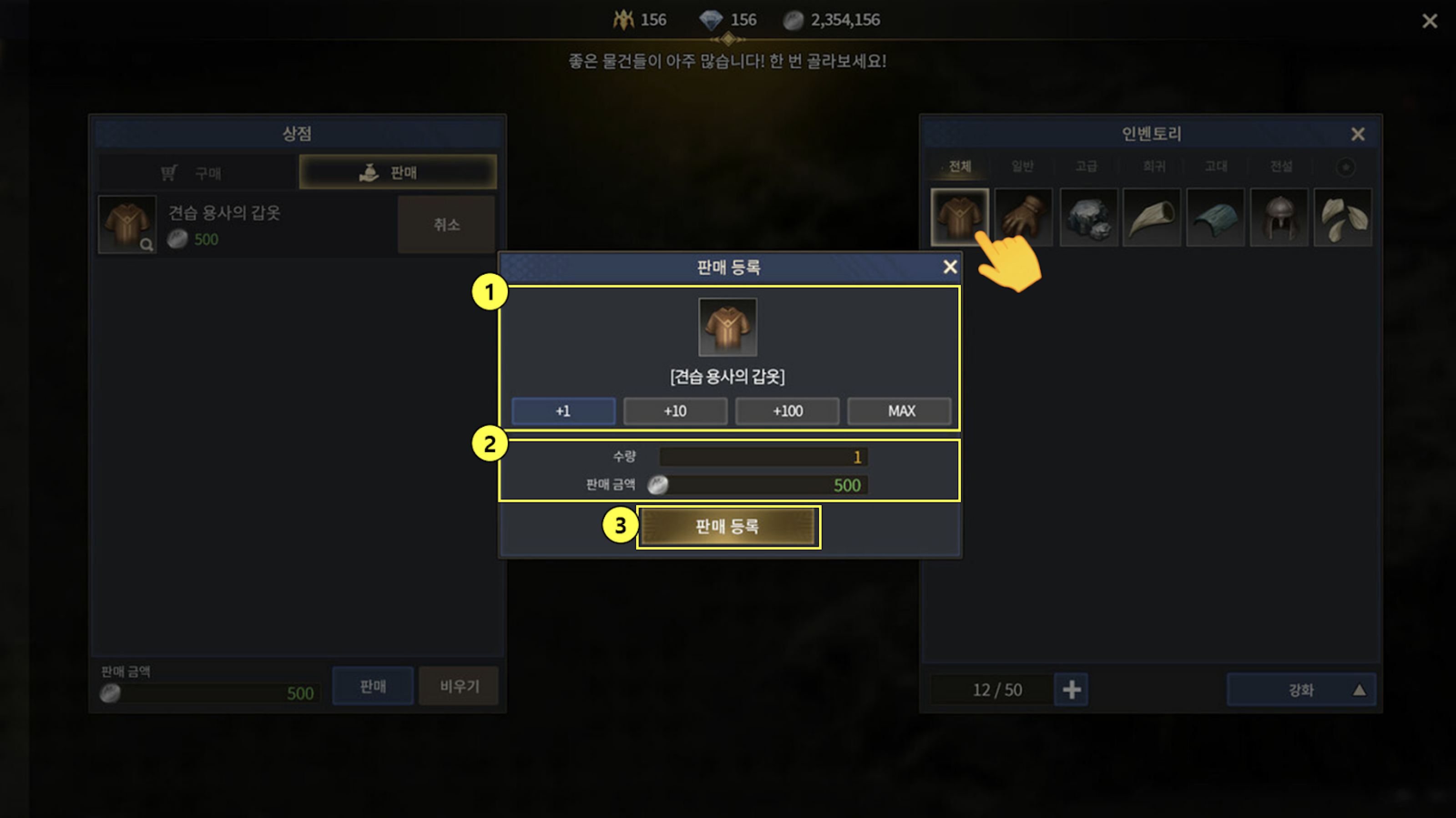 * 보유한 물품을 등록하지 않으면 판매가 이루어지지 않습니다.