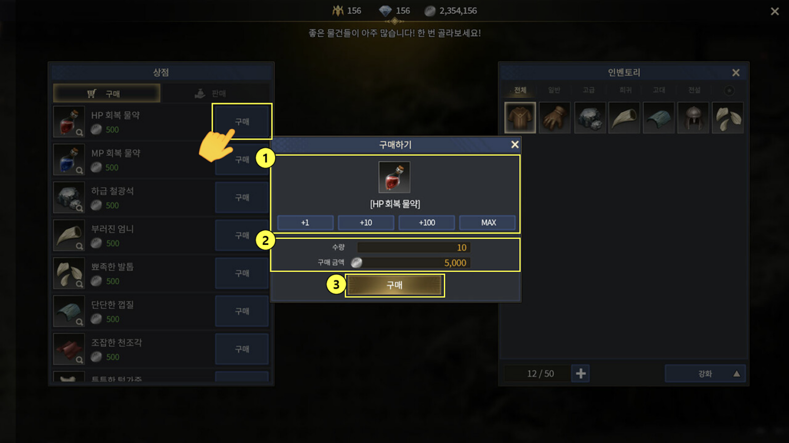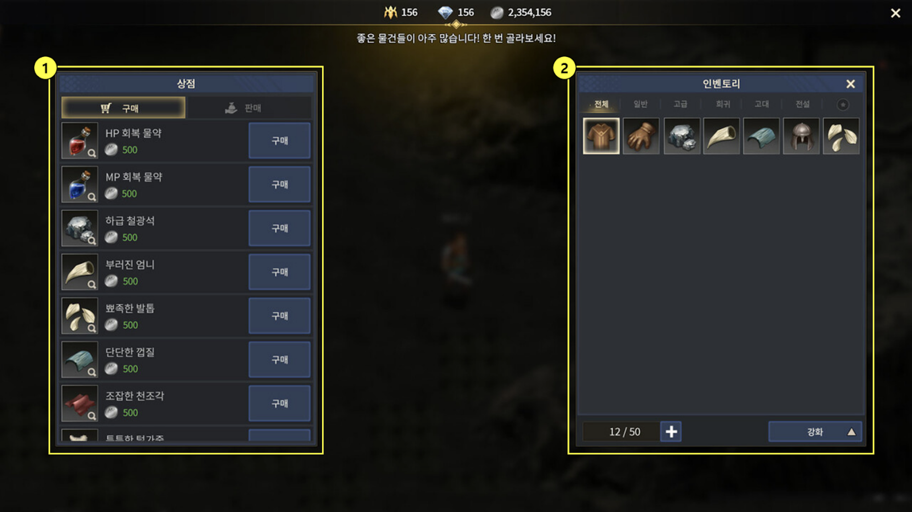 * NPC가 보유한 물품을 구매하거나 인벤토리에 보유한 물품을 NPC에게 판매할 수 있습니다.