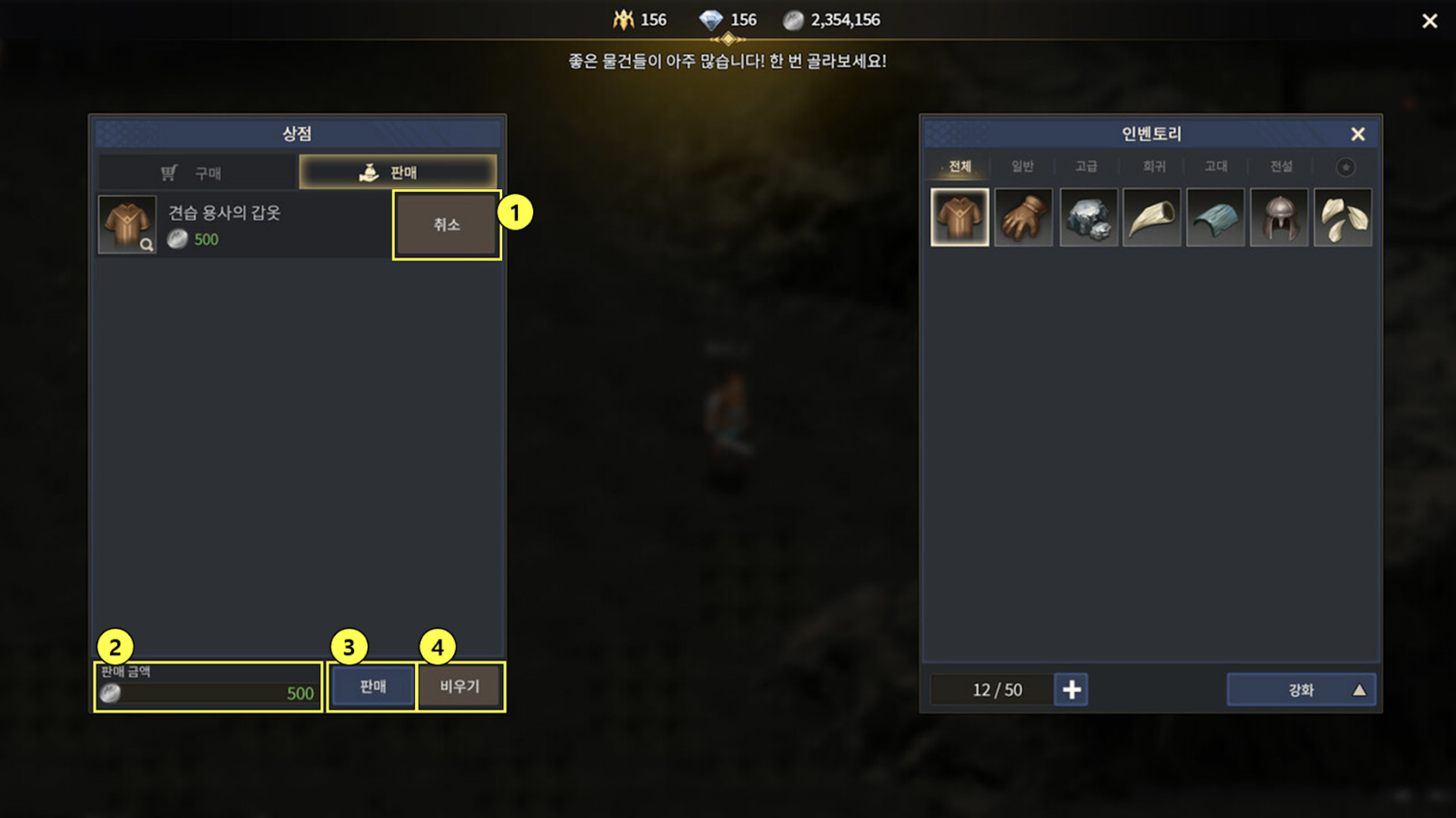 * 인벤토리에 보유한 물품을 NPC에게 정해진 가격에 판매할 수 있습니다.
